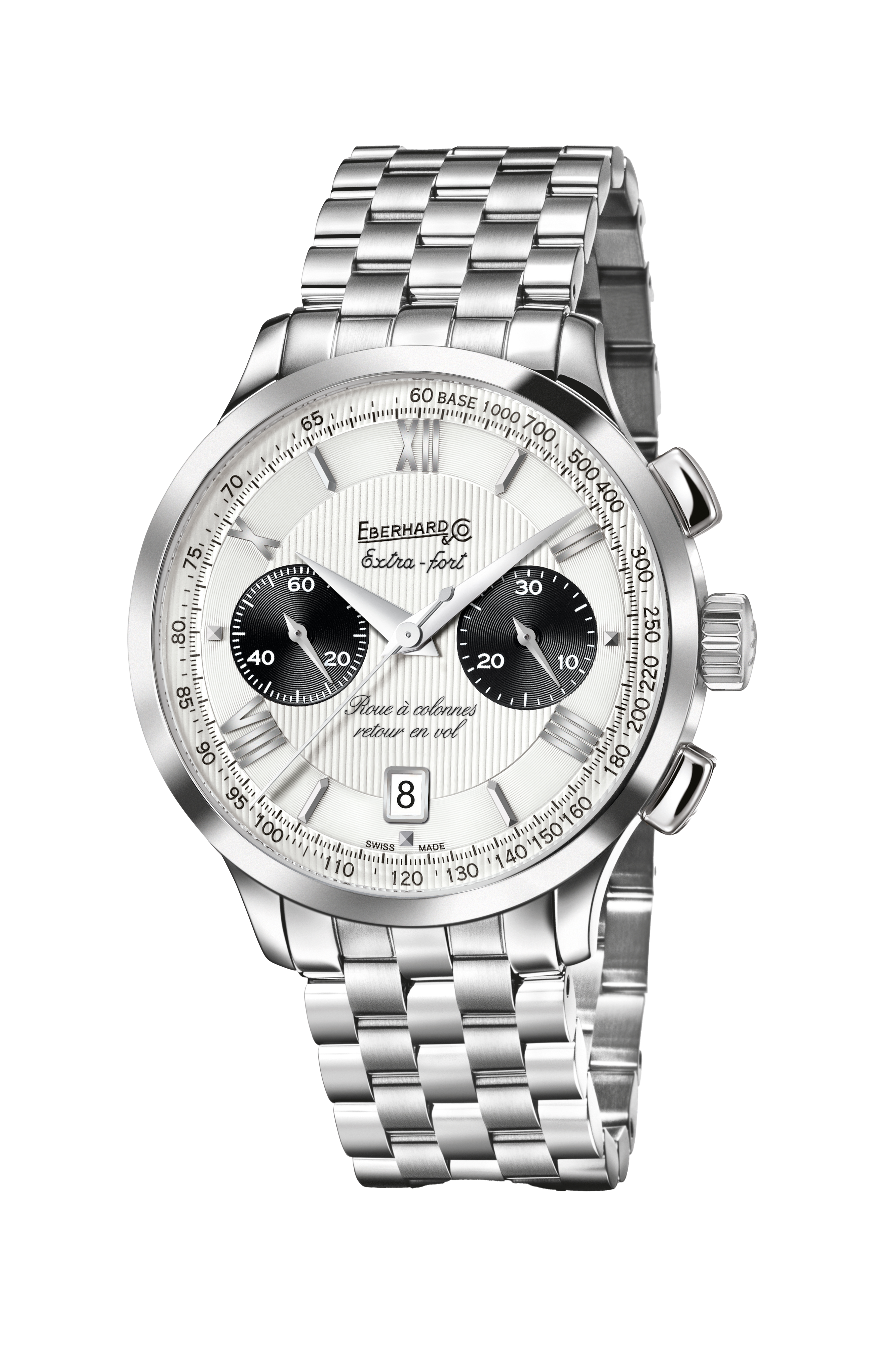 4時位置のボタン: クロノグラフのリセット。フライバック機能のために離すとクロノグラフが瞬時にリセットされ、再起動。文字盤: